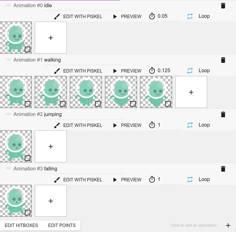 Open the properties of the player object and create the animations “idle”, "walking","jumping" and "falling". Then create a string variable on the player object and call it “direction” with the value “right”.