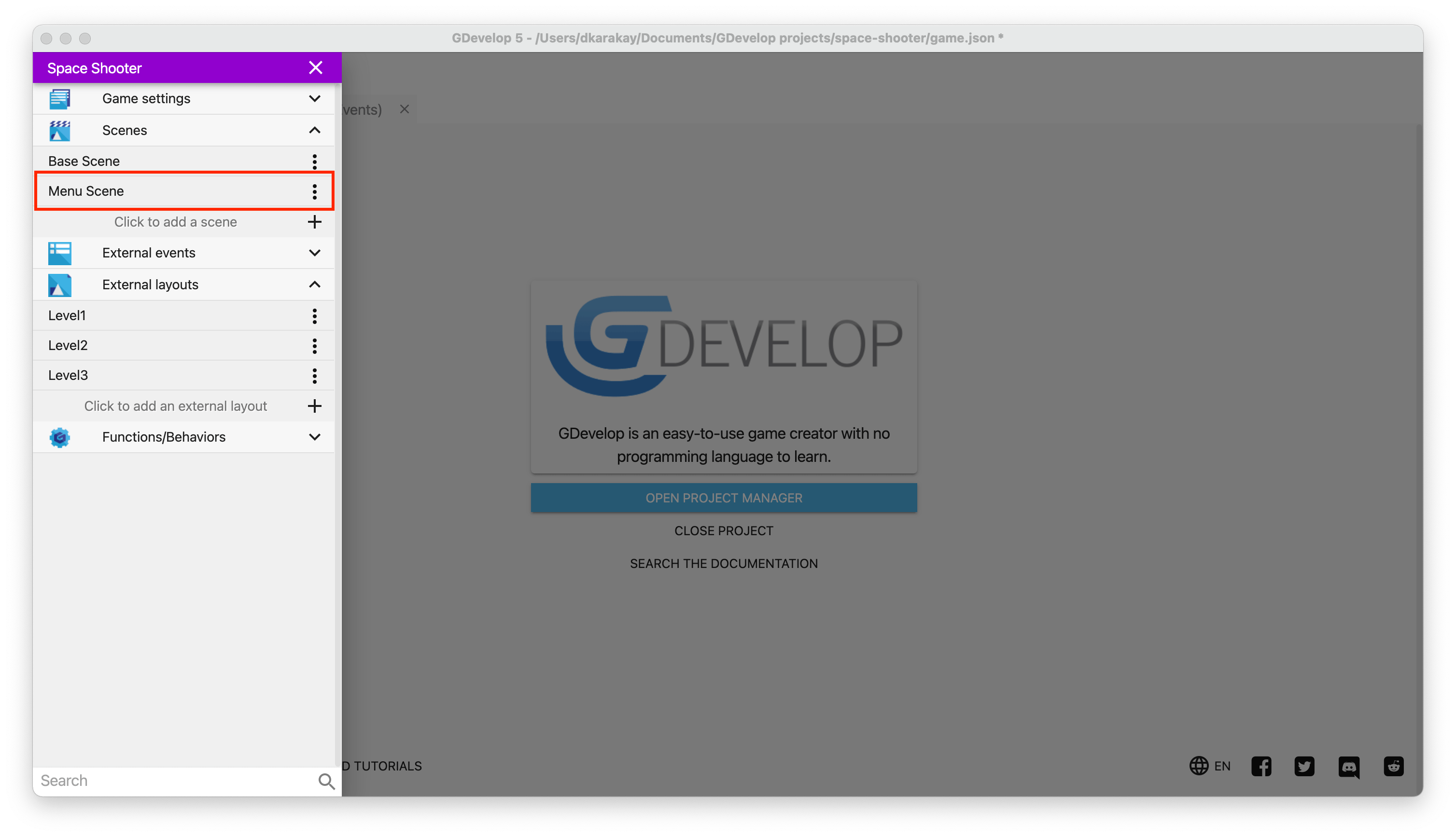 Open the project manager from the upper right corner, and create a new scene called Main Menu.