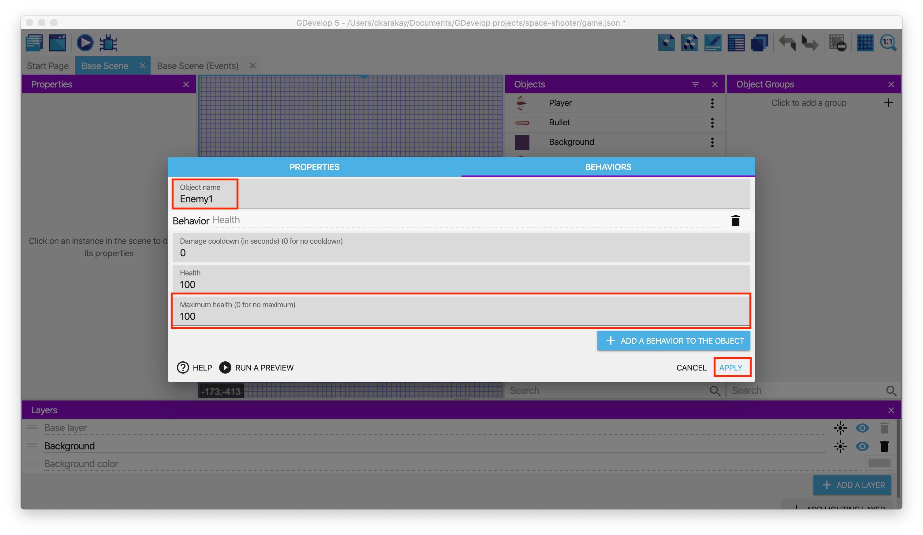 Then, open the behavior page of Enemy1 and leave it as is: Health: 100, Maximum health: 100
